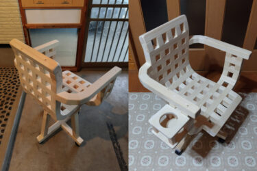 また、「座面が前方への出っ張り過ぎて当たる」ので短くし、反対に背もたれを高く。
