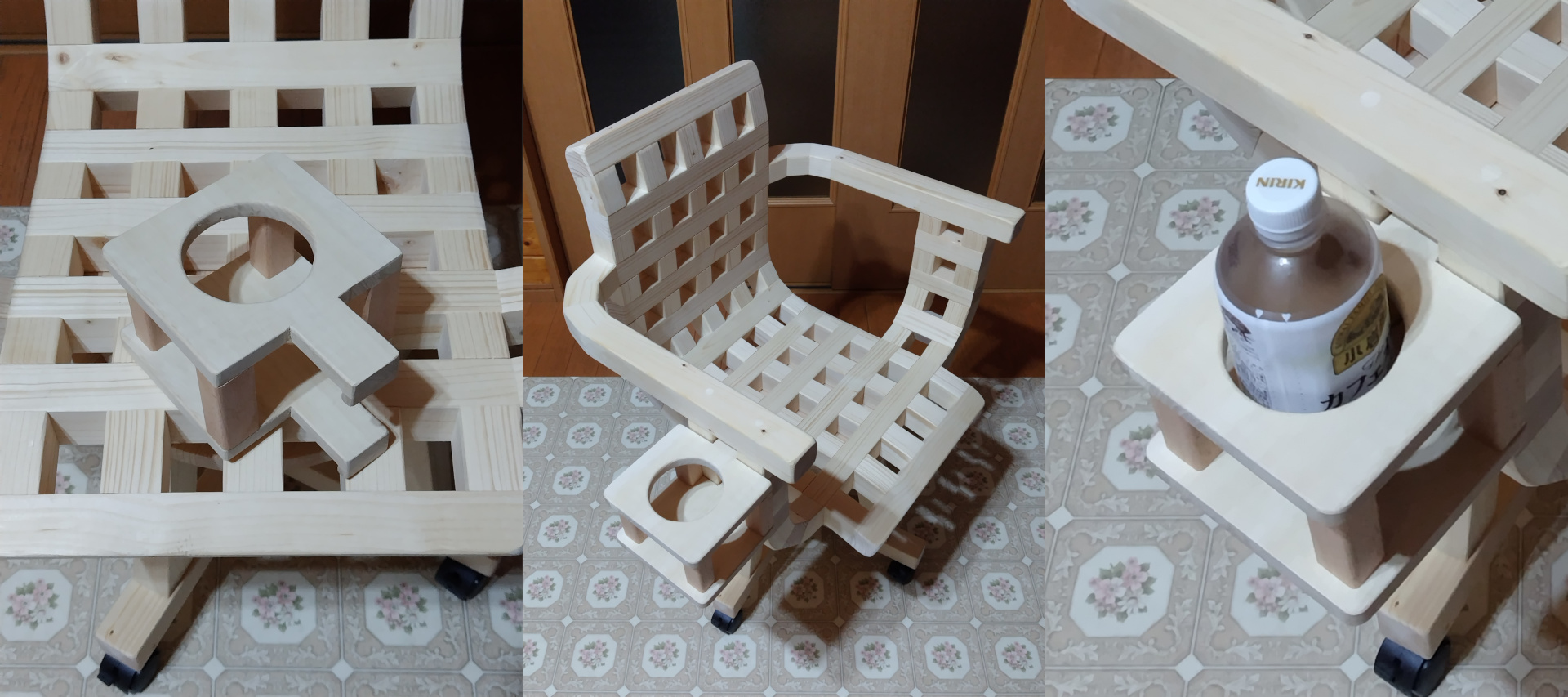 肘掛けのグリッド部分に引っ掛けて使うカップホルダーを作成。
