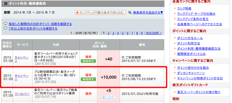 また、購入時期に、楽天ゴールデンイーグルスの開幕戦応援キャンペーン(だったかな?)が開かれていたので参加してみました。最大9店舗の買い物でポイント9倍に。また、9店舗以上(一店舗1000円以上購入が対象)で買い物した方、抽選で50名に購入代金(最大10万ポイント=10万円分まで)をキャッシュバックしてくれます。・・・期待はしてませんが、当たったらかなり嬉しいでしょうね。