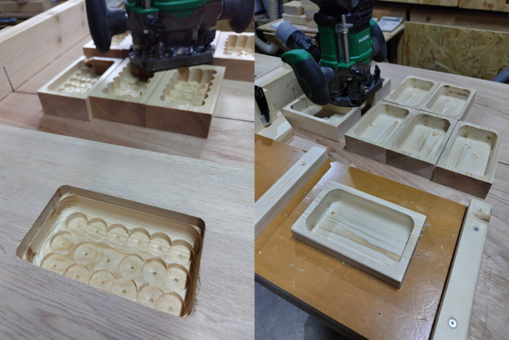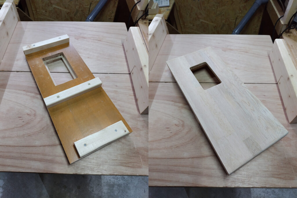 ルーターにデッシュビットを取り付け、2バイ4材を長方形の皿形に彫り込むための治具を作成。