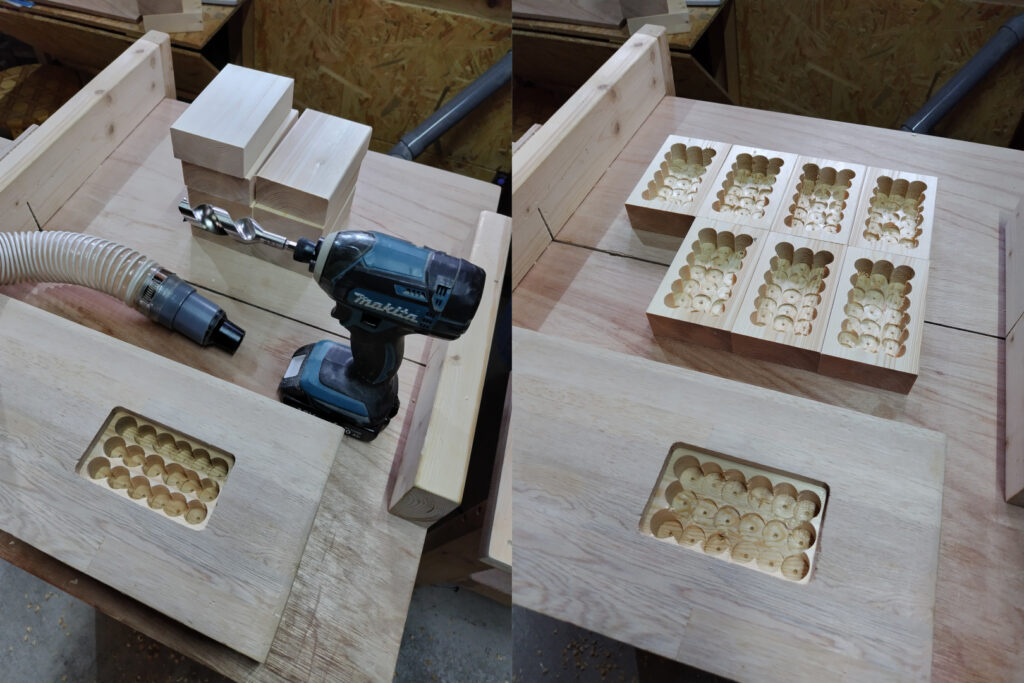 その後は、皿ビットが材料の内側面に沿うようにして、掘り進めます。(下写真右)