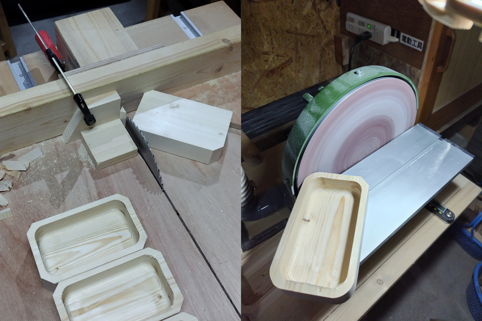 テーブルソーでカットし、ディスクサンダーで角を丸める!