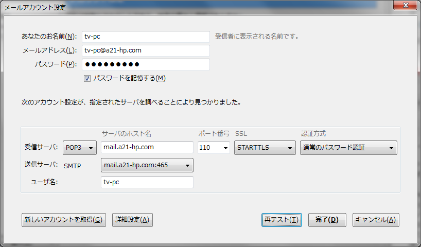 受信サーバを「SSL/TLS」にすると「・・・見つけられませんでした。」となり「完了」ボタンをクリックできないので、ここでは「STARTTLS」のままとします。